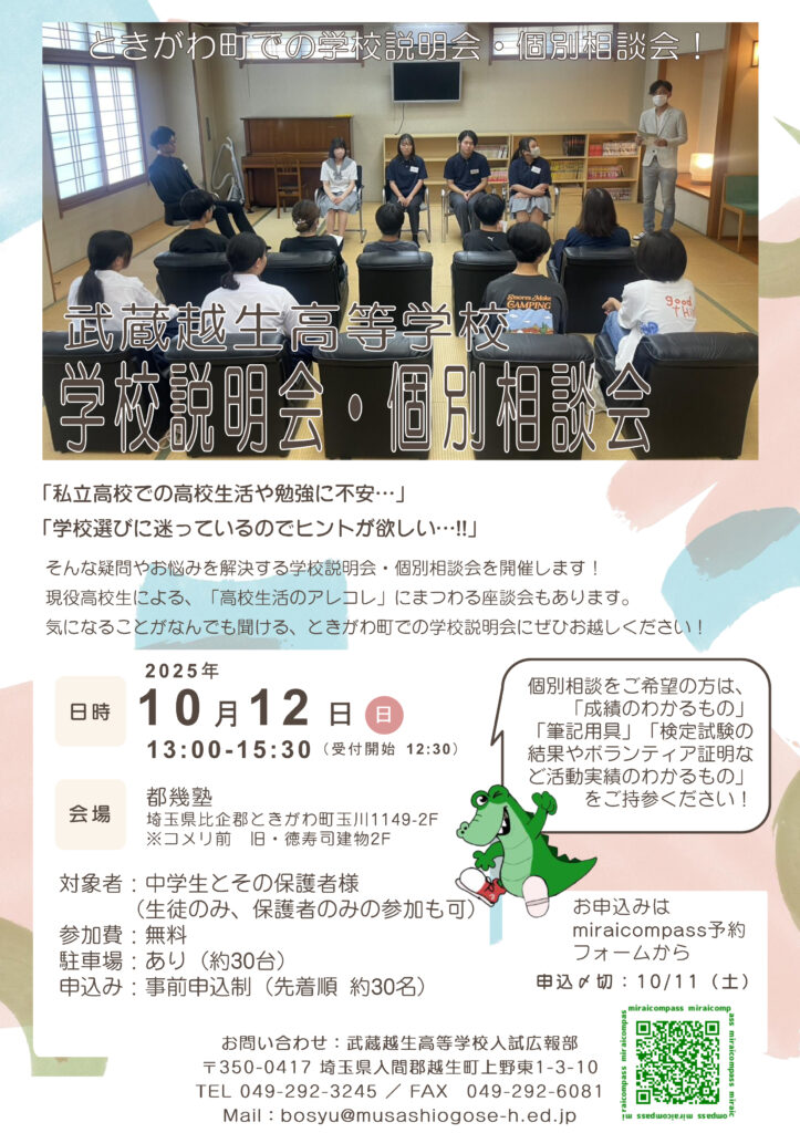 今回の後編では、主催は当塾ではなく武蔵越生高校という形にはなるものの、前回同様に高校生の皆さんと入試広報部の先生も来てくださり、高校生との座談会もしつつ個別面談会も同時開催されますので、ときがわ町近隣にお住いの方にとっては有益な会になるかと思います。
