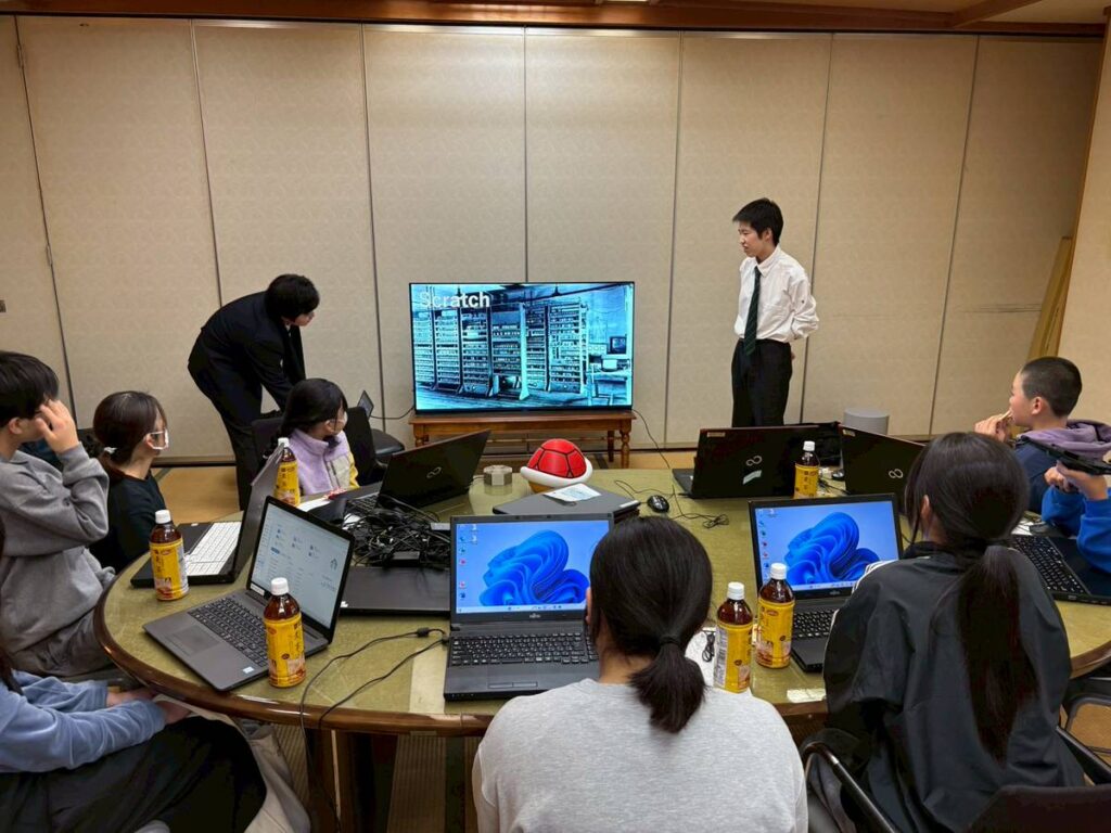 武蔵越生高校・情報処理部の生徒さん4名と、顧問の山口先生にお越し頂き、子どもたちにプログラミングの授業をして頂きました。